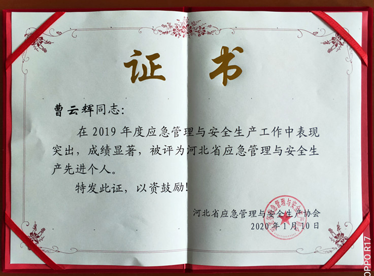 近日,我公司被河北省應急管理與安全生產協會評為2019年度河北省應急管理與安全生產先進單位,我公司曹云輝、周秀蘭同志被評為2019年度河北省應急管理與安全生產先進個人。